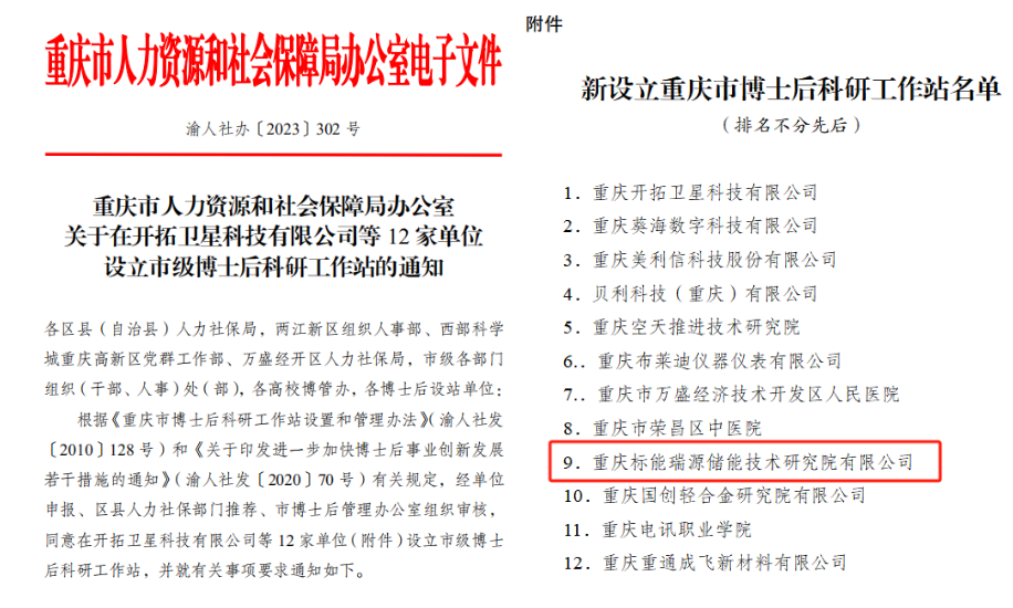 11月15日,重庆市人力资源和社会保障局办公室下发《关于在开拓卫星科技有限公司等12家单位设立市级博士后科研工作站的通知》(渝人社办〔2023〕302号)。重庆标能瑞源储能技术研究院有限公司榜上有名,标志着公司在科研平台建设、核心人才培养方面迈上新台阶。